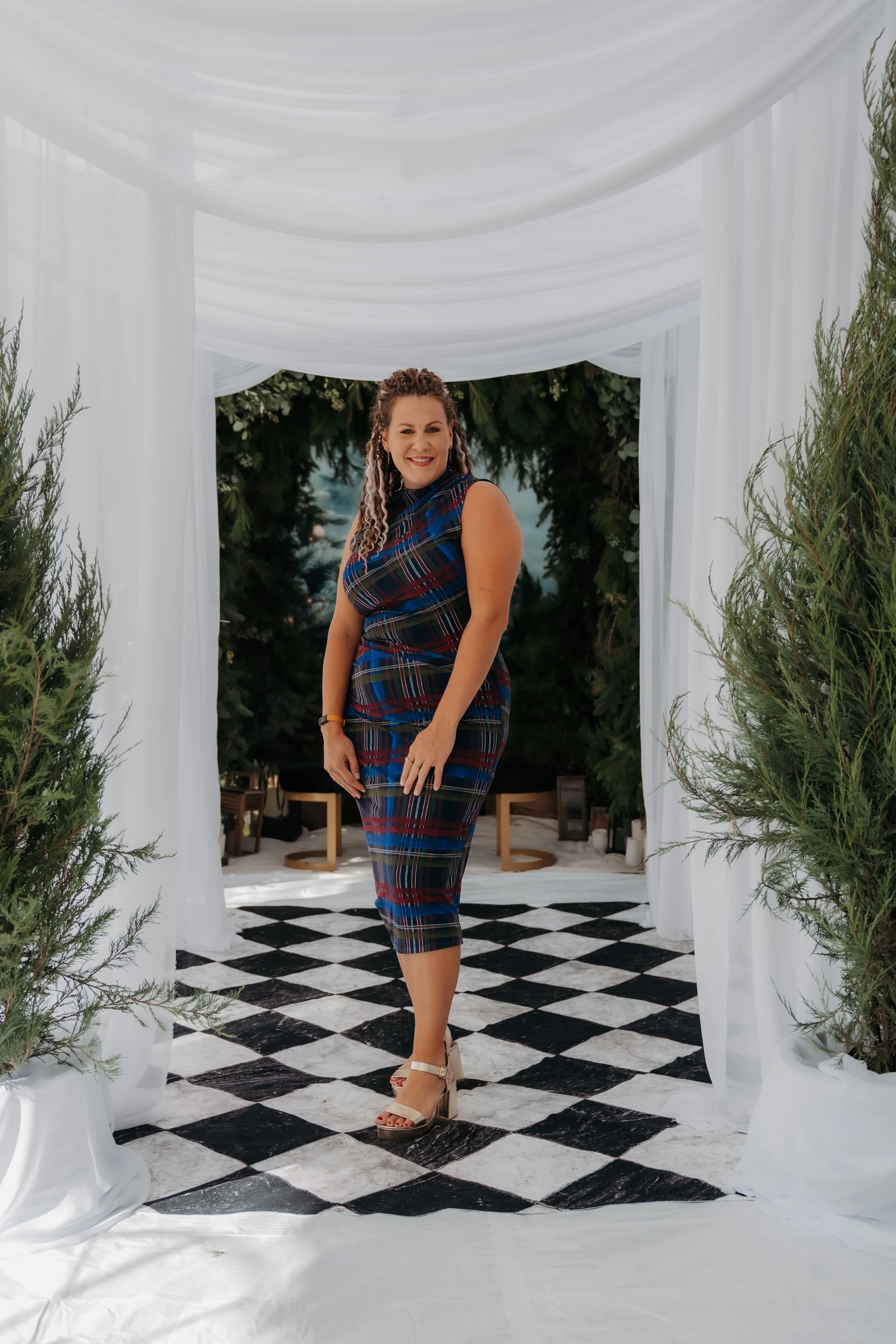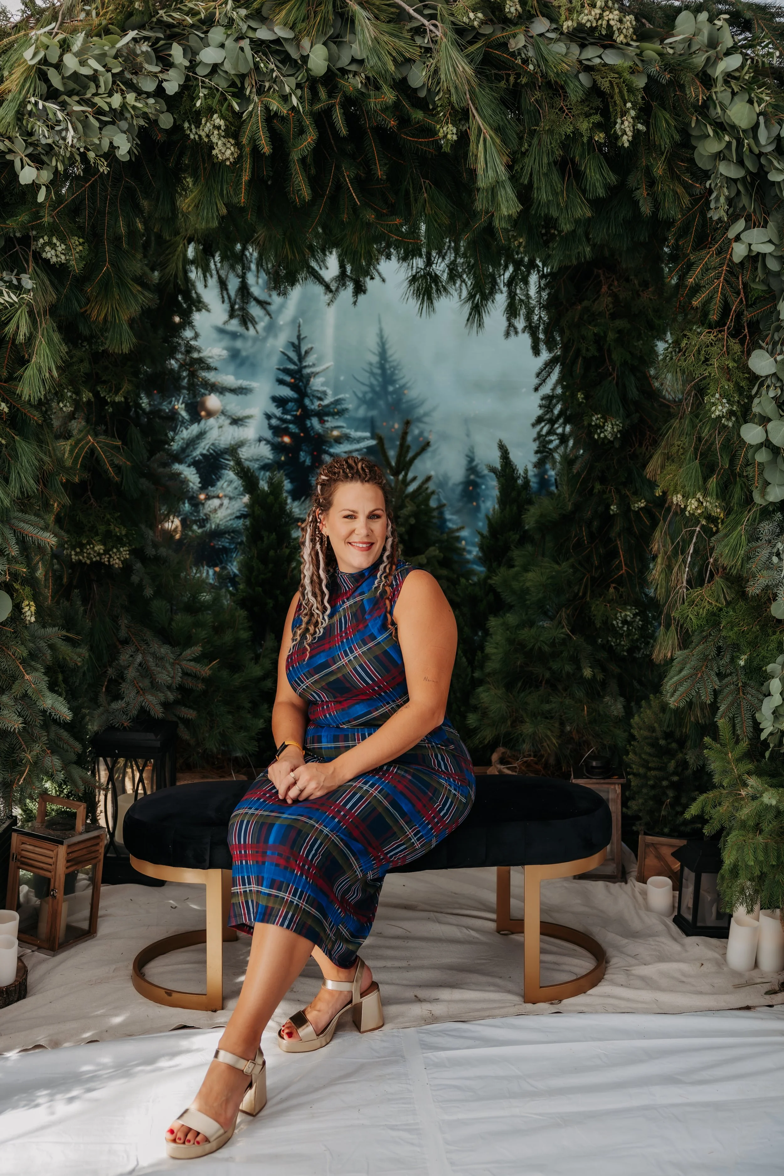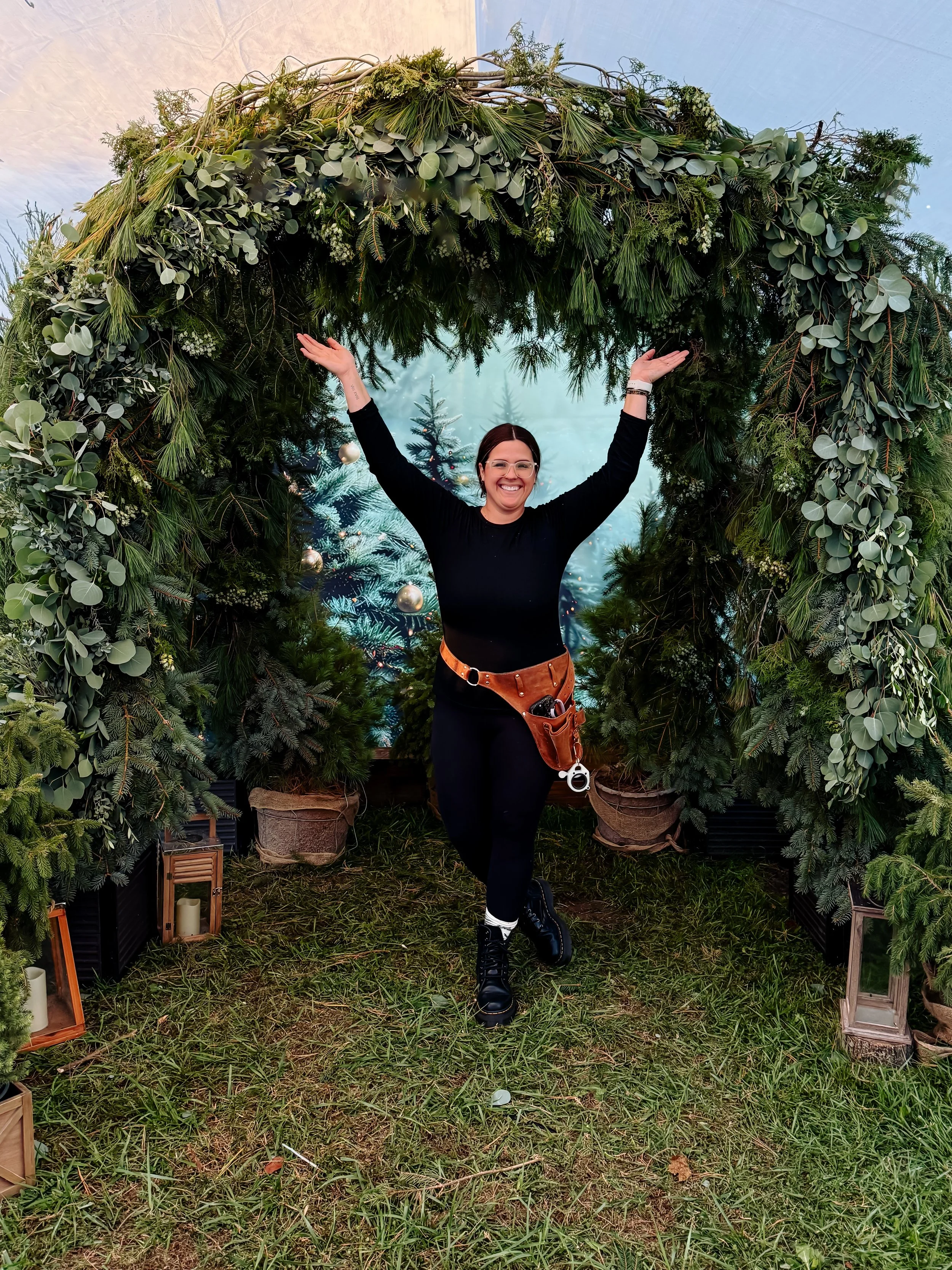 The garland was built on site, cascading naturally to create depth and warmth for photographers and families alike. Its organic composition balanced structure and movement, offering the perfect blend of wild elegance and timeless holiday charm.