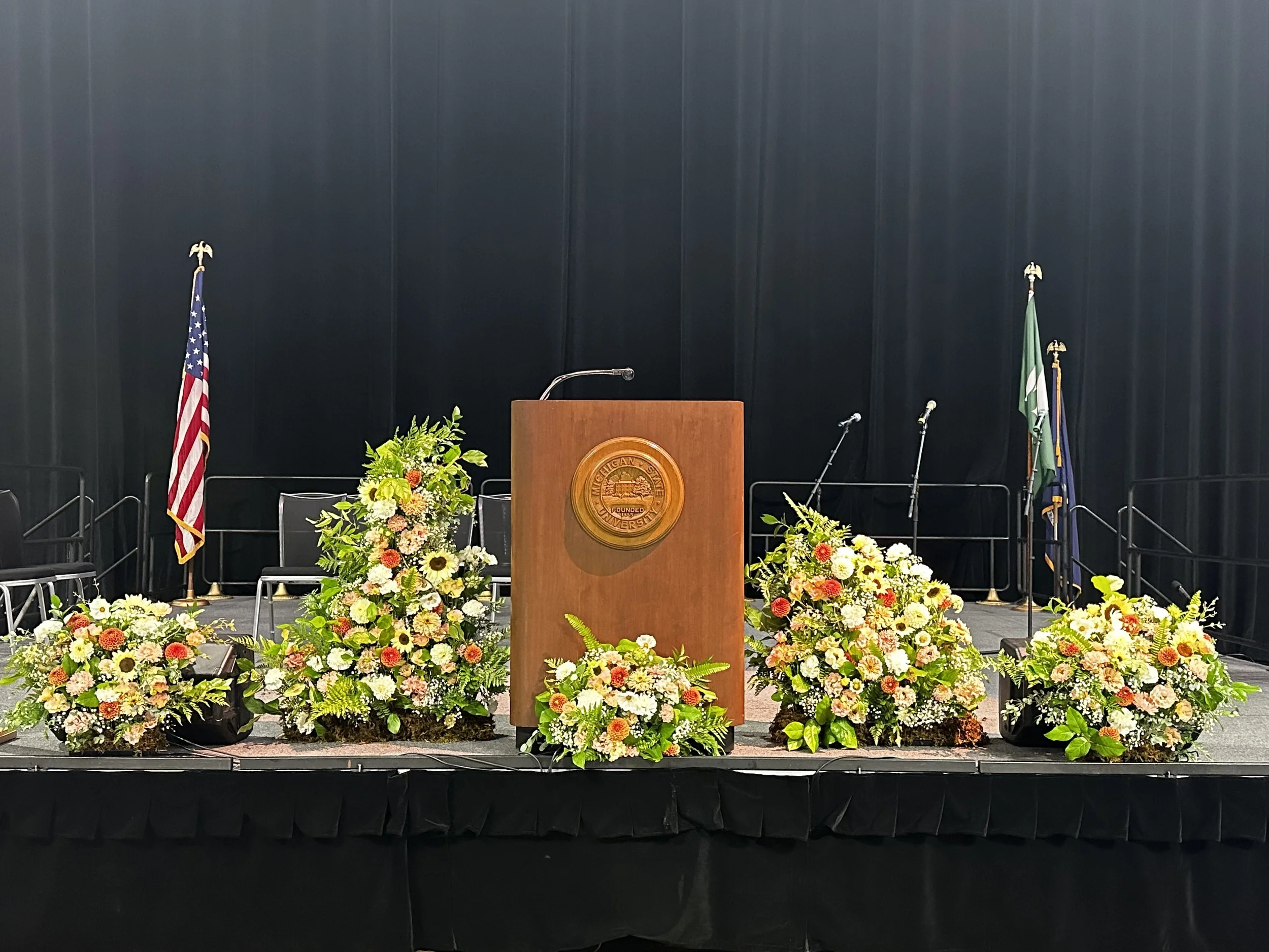 A garden-inspired stage design created for a corporate event at Michigan State University. Lush layers of dahlias, roses, accent flowers and greenery brought natural movement and warmth to the space—proving even the most structured settings can bloom with intention.